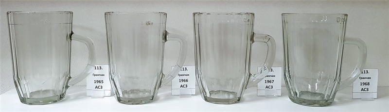 • Mug of the Artyomovsk plant. 20 facets. Stamp at the level of the filling line outside the mug. The hallmark code is 1X. Inscription on the bottom: “САЗ РТУ 694-62 УССР”