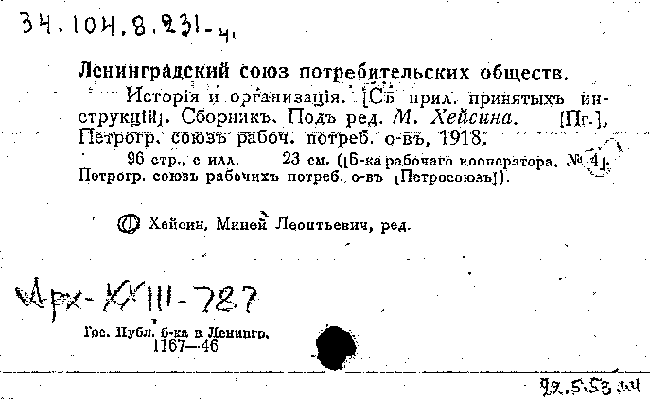 В Петербургской губернии потребительские общества впервые объединились в Санкт-Петербургский союз в 1913 году. Первое объединительное собрание представителей потребительских обществ Петербурга, Новгородской, Олонецкой и Псковской губерний, санкционированное в апреле 1913 года, состоялось только 27 декабря 1913 года, председателем собрания был Миней Леонтьевич Хейсин.