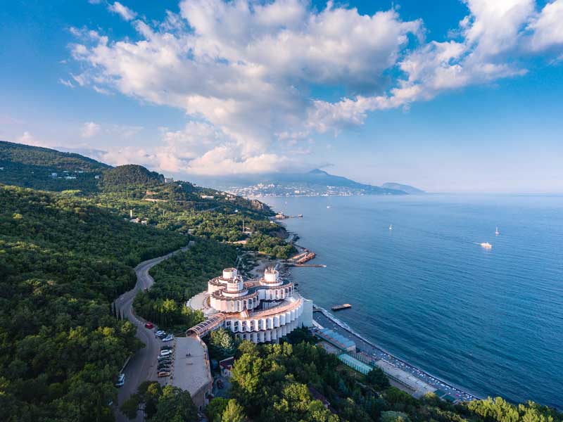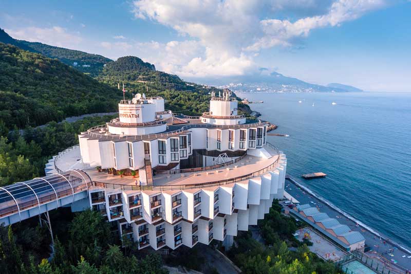 Курортная архитектура всегда была территорией свободы для советских архитекторов. Санатории выполняли функцию «рая на земле» – места, куда стремились попасть все трудящиеся. Поэтому даже в эпоху борьбы с излишествами ведомства не скупились на постройку дворцов отдыха для своих работников, и курортное строительство позволяло архитекторам значительно отклоняться от общей линии. Так, в 1980 руководители профсоюзов СССР и Чехословакии приняли решение о совместном строительстве пансионата «Дружба» в Крыму для трудящихся двух стран. Чехам хотелось, чтобы пансионат был расположен в месте, где прошла их романтическая юность – на Золотом пляже. Но в те годы побережье уже было застроено, оставался лишь узкий кусок территории с 40-градусным уклоном между дорогой и морем. Место под строительство было с разломом земной коры и наличием оползня, а также характеризовалось сейсмичностью в 9 баллов. Авторским коллективом «Курортпроекта» в 1978—1980 годах был разработан особый проект здания. Была предложена устойчивая конструкция на трёх башенных опорах, которые передавали нагрузку от здания скале.