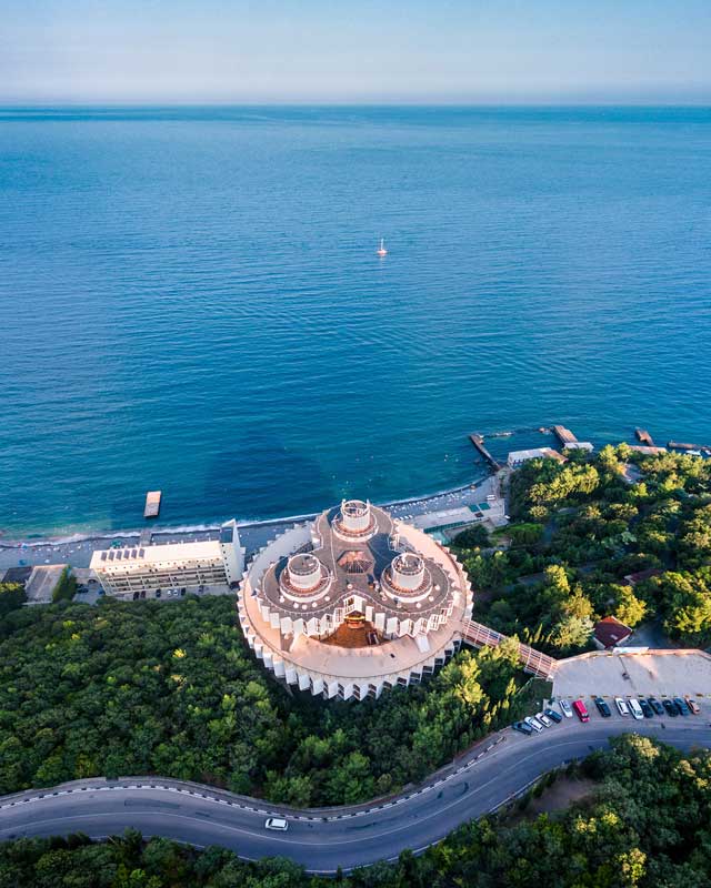 Гостиничные номера располагаются за внешним кольцом здания и обращены на море. Между номерами и атриумом находятся световые открытые дворы. Опоры огибает остеклённый коридор-галерея, который расширяется конусом верх по этажам. Там расположены кафе, бильярдная, тренажёрный зал. Венчает здание трёхчастный консольный ресторан. Крыша пятого этажа находится на уровне подъездной площадки и главного входа в пансионат. На крыша устроена видовая площадка с панорамным обзором на высоте 56 метров над уровнем моря. В опорах здания находятся три скоростных лифта, которые доставляют отдыхающих на жилые этажи и берег моря. Благодаря архитектурной особенности здания сохранились без изменения естественный рельеф склона и существующая растительность. Также впервые на всём объекте отопление и горячее водоснабжение было обеспечено за счёт использования тепловой энергии моря.