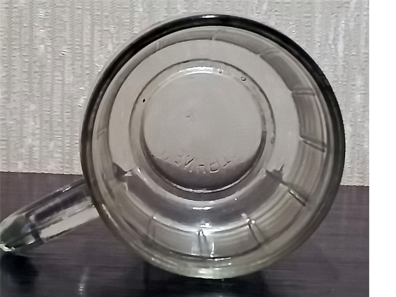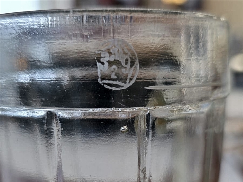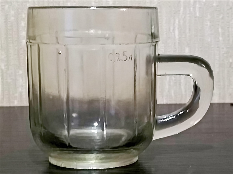 • Кружка изготовлена в 1939 году на заводе ''ВОССТАНИЕ'', номер поверочного клейма - 2 Ленинград. Черта линии налива - надпил на ободке, обозначение объёма - литое 0,25 л на боковой грани слева от ручки. Рисунок на боковой поверхности - 12 прямых граней разделённые выпуклыми прямыми линиями. Вес- 345 грамм , высота - 95 мм, диаметр верха - 80 мм, диаметр низа 55 мм. Надпись на донышке: 'Завод ,,ВОССТАНИЕ" '.