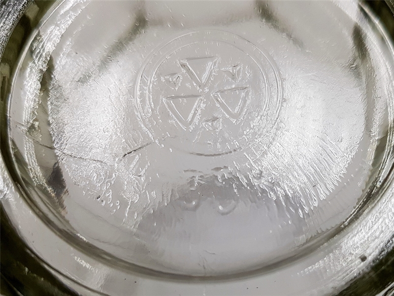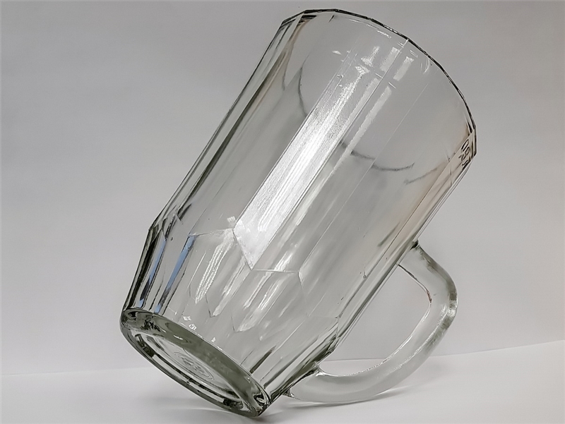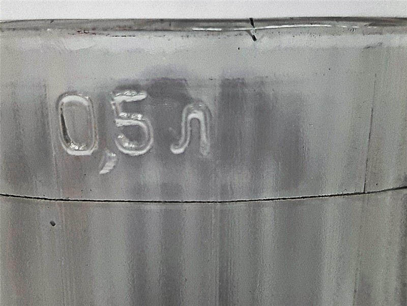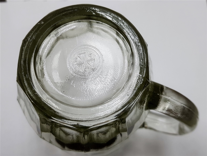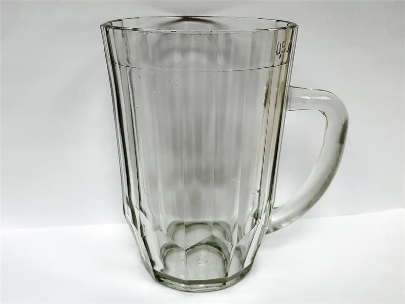 • Эта кружка изготовлена на Уршельском стекольном заводе, 20 граней. Обозначение объёма 0,5 л литое на наружной стороне ободка, левее ручки, третья грань. Поверочное клеймо отсутствует. Донышко – знак Уршельского стекольного завода и Ц 35 коп.